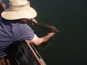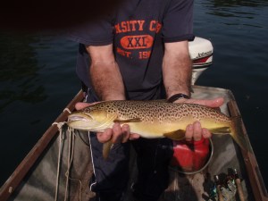Bro. and I took a couple of hours off today and went fishin. We had been informed that the “hopper” bite was on. It was a bit slow for us. Had a couple of takers but no hook ups until we got this one. Over twenty inches. They have been generating around the clock on the White starting up early on the Norfork so we haven’t been able to wade so we have been “working” around the place.