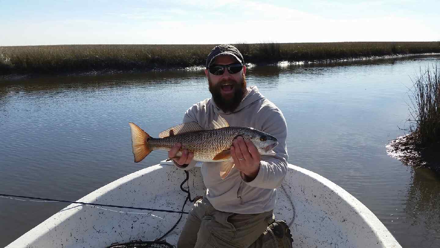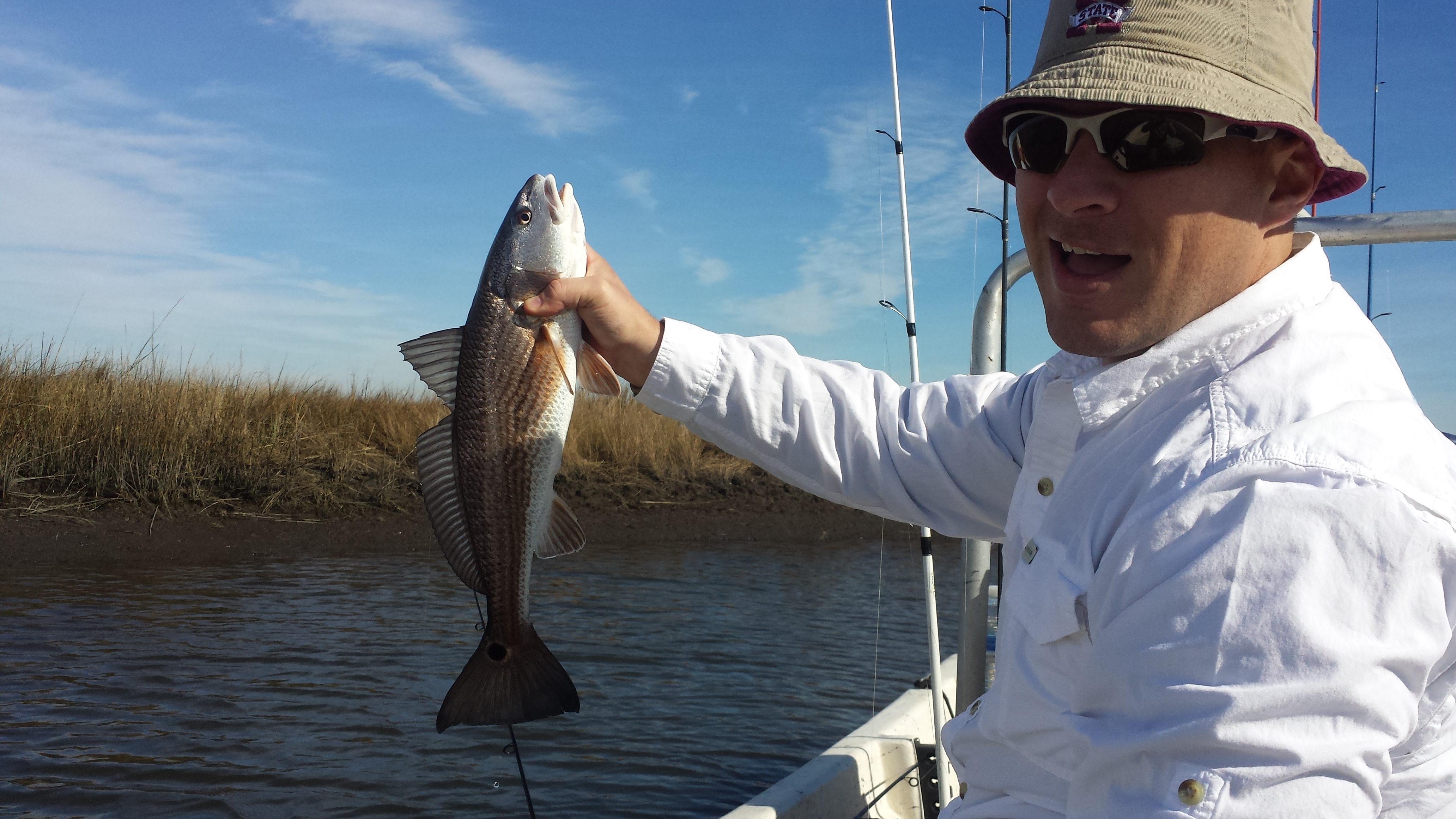 Fishing!!! At long last!!! It has been nearly 4 months since I really wet a line, and finally, the big moment has come. I got to try out the new Sage Xi3 on some beautiful Louisiana Redfish. Al’s old Marine buddy Cliff Baker lives in Pass Christian, MS, and exhibits a supreme passion for catching red drum on the Gulf Coast. Although he has never tried (and probably never will again) these brutes on the fly, he seemed pretty excited to put me on a few reds for the first time. The weather and wind were perfect, and though the water was a little low, it was clear. And we had more than a few shots at the beasts. But alas! it was Amateur Hour on the Marsh! Al had to ride in the middle while I stood on the bow and sight casted to perhaps dozens of reds. I only managed to land one (on Bruce’s Crab, my own pattern) and lost another. They were a little spooky, and Al likewise only brought one to hand. But Cliff picked up the slack by boating four reds, and we came away fairly satisfied. I’m already looking at boats and land near the coast! Thanks to Cliff for housing and feeding, and above all, guiding us to a perfect weekend in the middle of the week. We will definitely see you again soon!